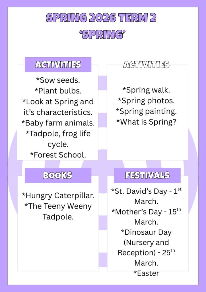 This half term our topic will be Spring. This is the basis of our planning for the next five weeks, however they are not steadfast plans and may change according to the children’s interests. As well as the plans below we will of course also be celebrating World Book Day!